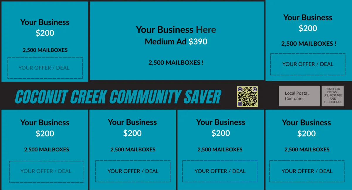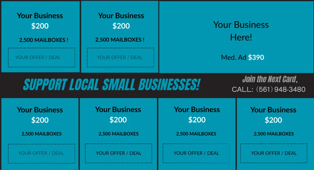 We Direct Mail a large 12X6 ½" Oversized postcard featuring ads from up to 16 local businesses. Each with their own dedicated ad space.